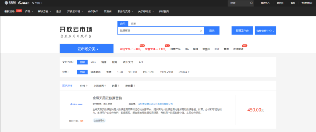 # 订购路径:移动云-开放云市场-搜索“广东会云数据智脑”